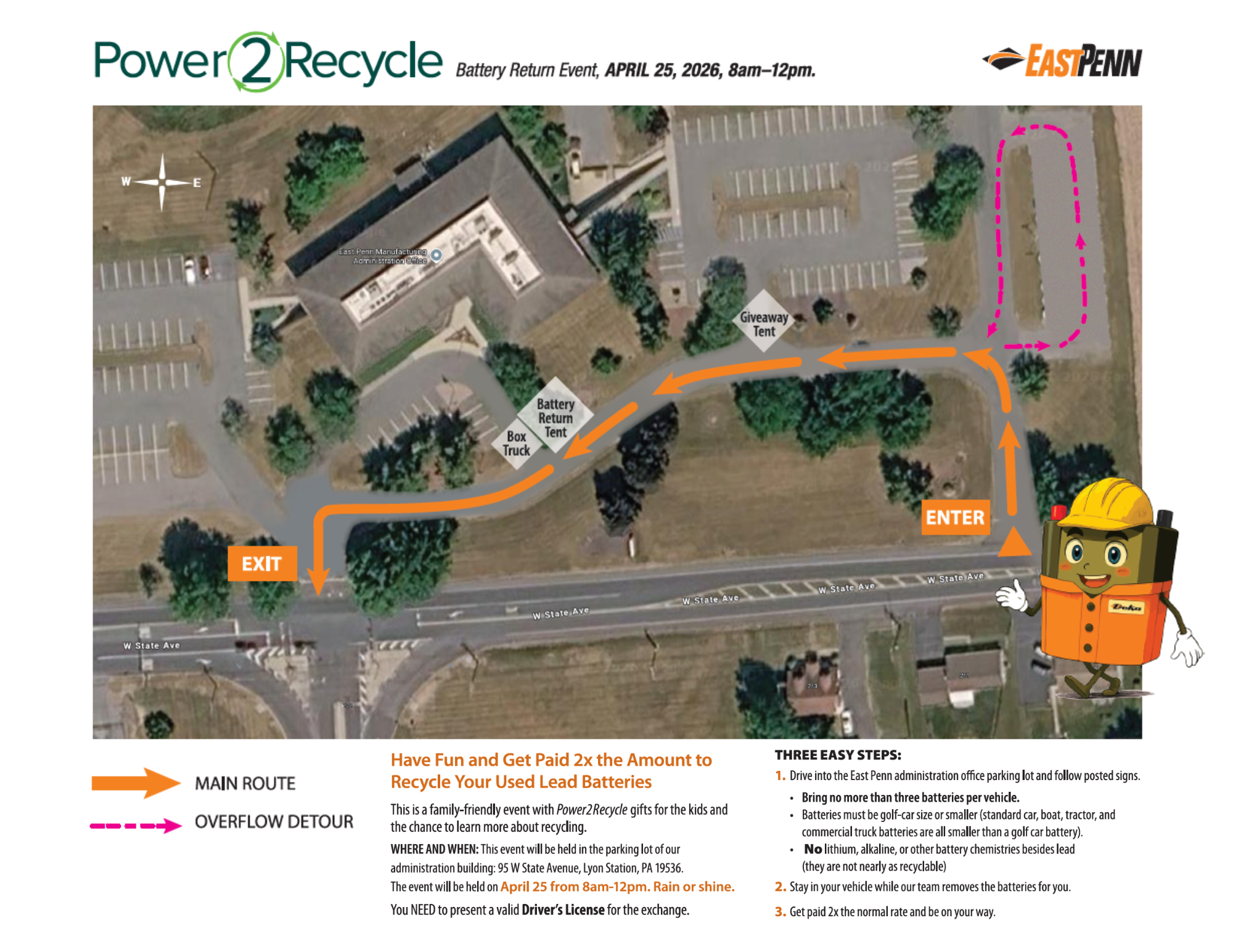 WHY. Because it’s worth it. On April 25 from 8am-12pm, East Penn will host a Power2Recycle event to promote the recycling of lead batteries. This event will feature a drive-through experience so you can return your used car, truck, boat, motorcycle, garden tractor, etc. lead battery—without getting out of your car!